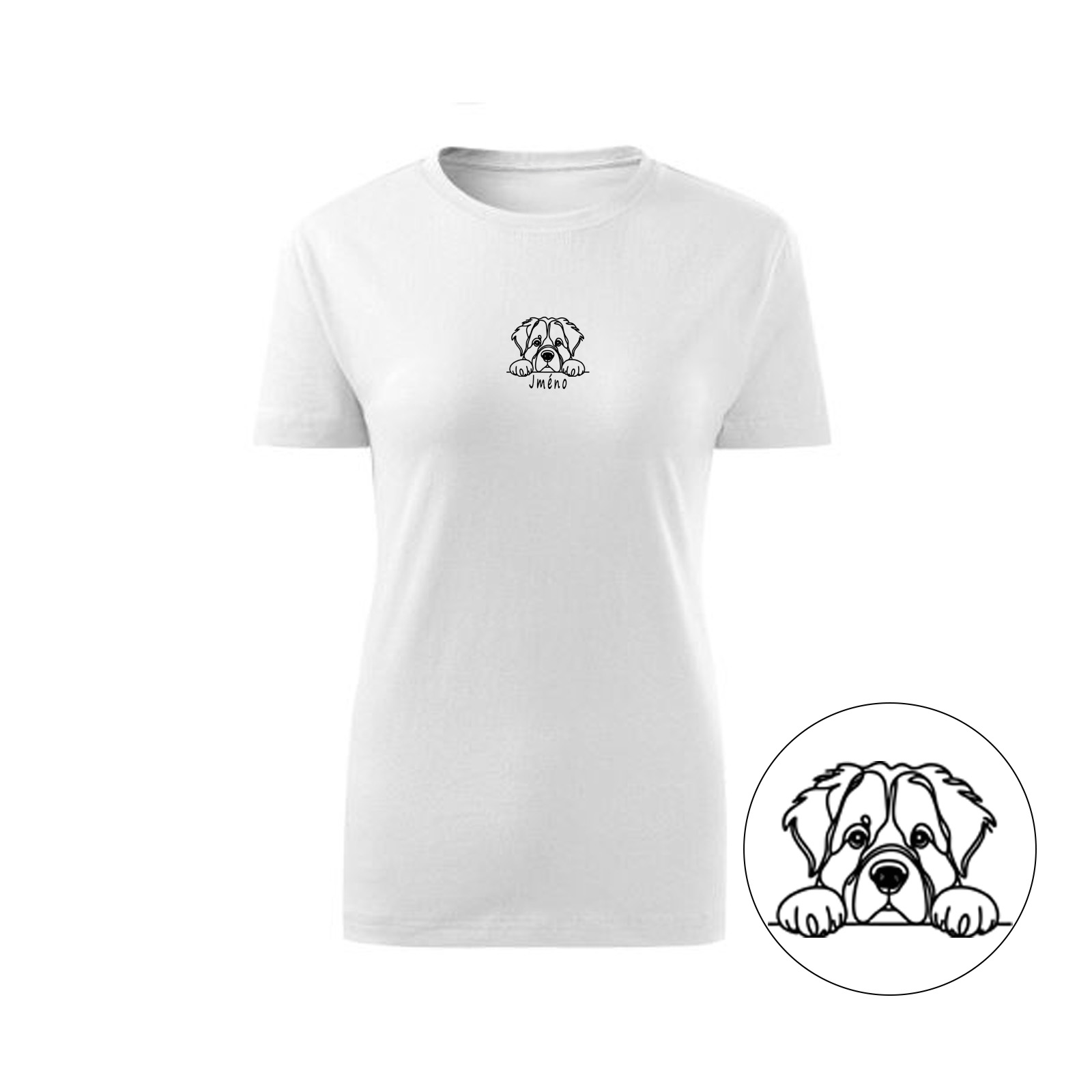 Personalizované dámské tričko s výšivkou vašeho pejska a jeho jménem 🐾. Vyberte si barvu trička, barvu výšivky i plemeno.