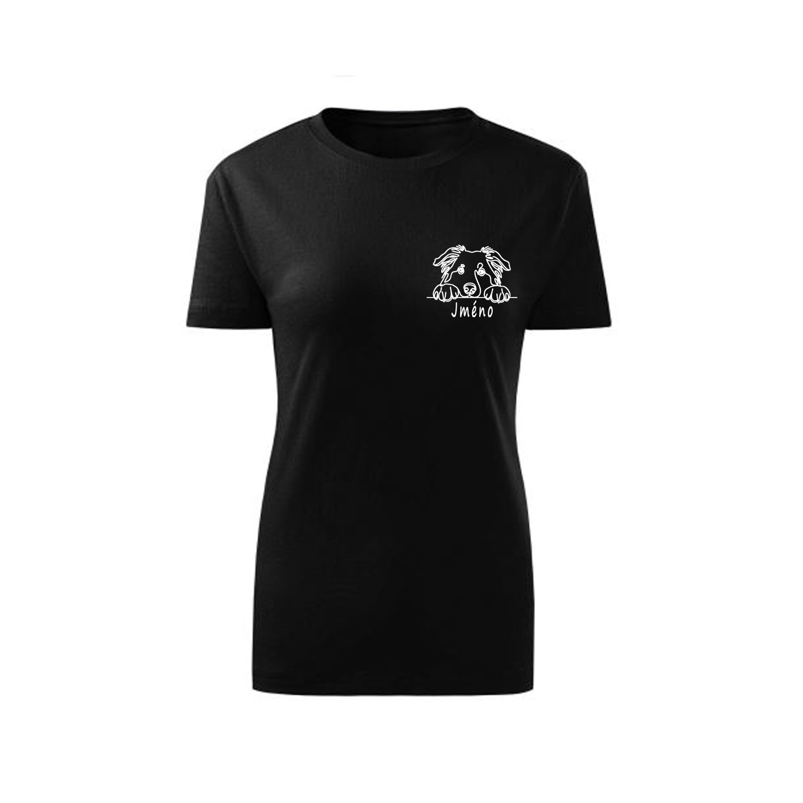 Personalizované dámské tričko s výšivkou vašeho pejska a jeho jménem 🐾. Vyberte si barvu trička, barvu výšivky i plemeno.